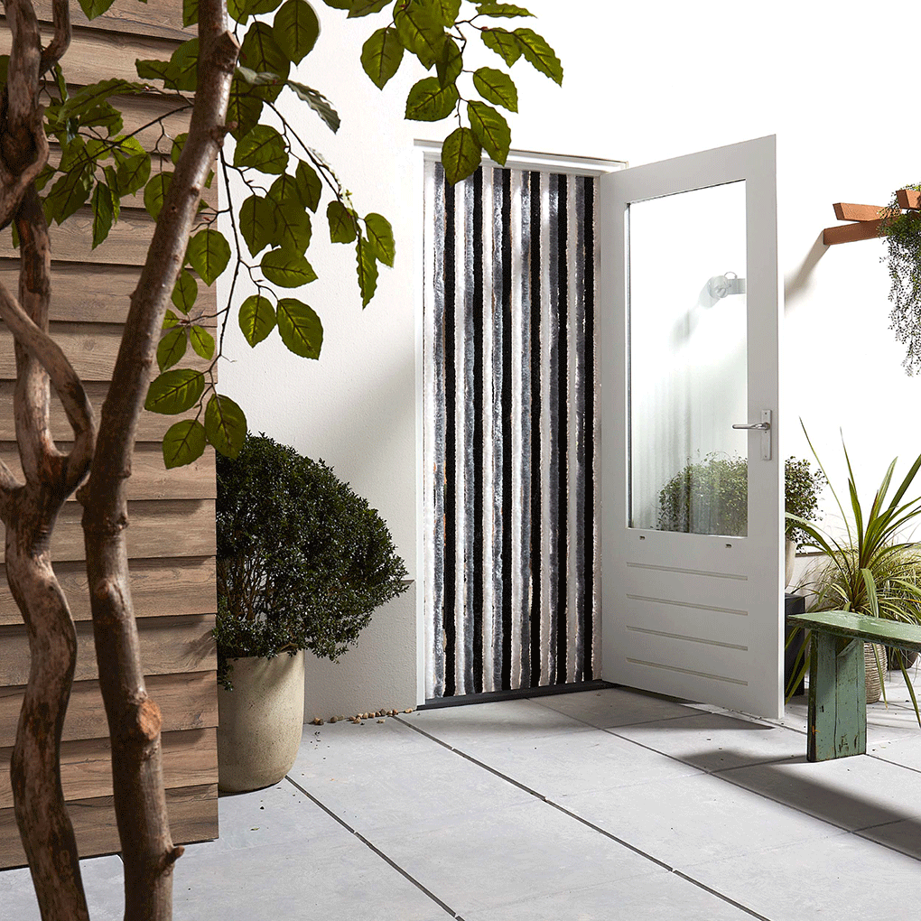 Staat jouw buitendeur geregeld open om frisse lucht binnen te krijgen? Het Livn deurgordijn Chenille voorkomt dat insecten en ander ongedierte naar binnen glippen. Je maakt het vliegengordijn eenvoudig zelf op maat. Zowel de hoogte als de breedte zijn onbeperkt in te korten. Het voordeel van een zacht kattenstaart gordijn? Je loopt er gemakkelijk doorheen, ook met volle handen! Dit maakt het tevens een ideale oplossing voor kinderen en huisdieren. De rail van het vliegengordijn is gemaakt van kunststof en de grijs, zwart en wit strengen van polypropyleen.
