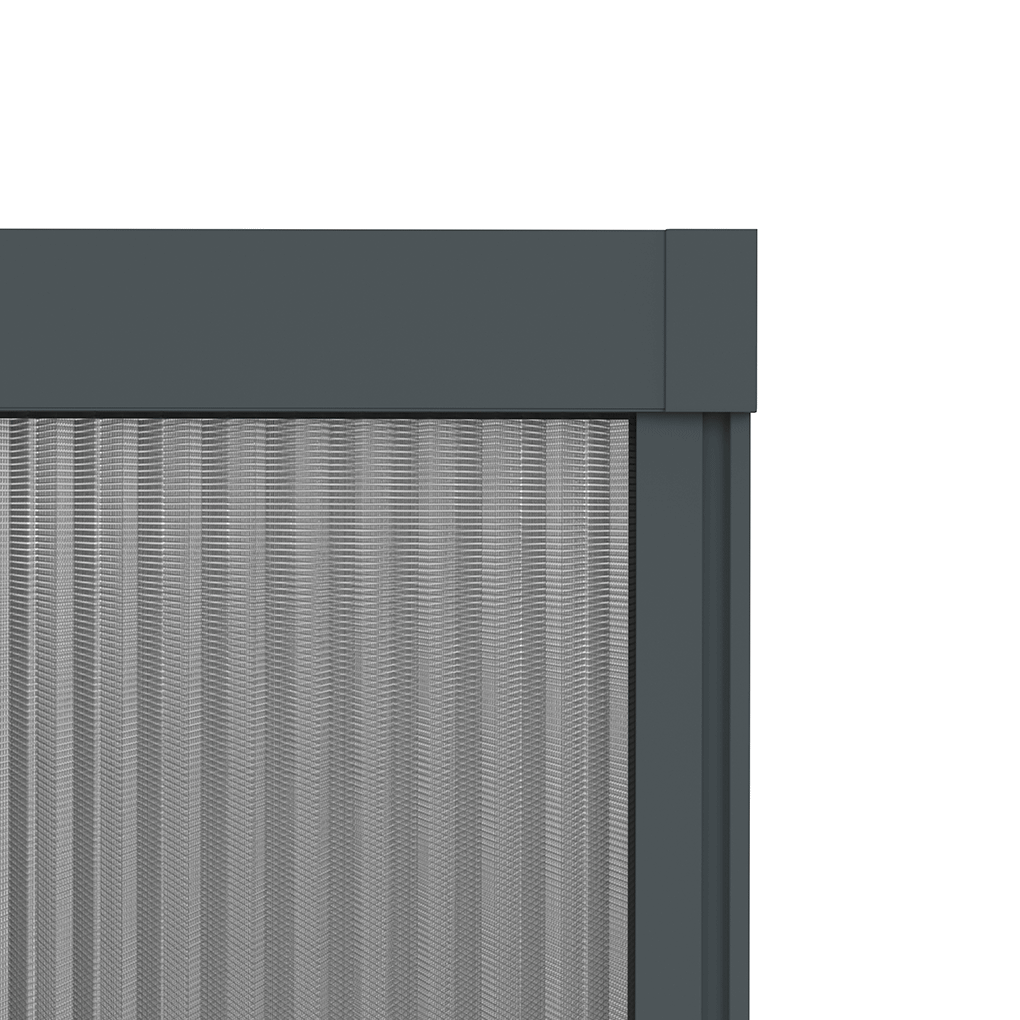 De aluminium cassette en rails zijn uitgevoerd in antraciet (RAL7016). Het zwarte polyester gaas wordt aan de onderzijde geleid door een ketting. Zo blijft het ook op een winderige dag netjes op zijn plek. Daarnaast is de plissé schuifhordeur op iedere gewenste stand open te zetten. Ideaal als je vaak van binnen naar buiten loopt en andersom!