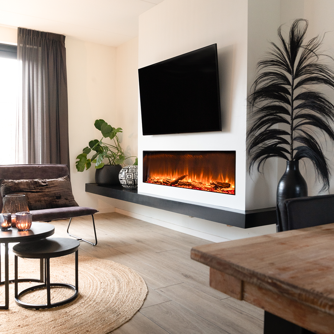 Het strakke design van inbouwhaard Essence 140 past perfect in moderne woningen. Gebruik de haard als extra bijverwarming of ter decoratie. De inbouwhaard wordt geleverd met houtblokken, diverse soorten stenen en een afstandsbediening. Dankzij de WiFi functie bedien je de inbouwhaard eenvoudig met je smartphone via de Livn app.
