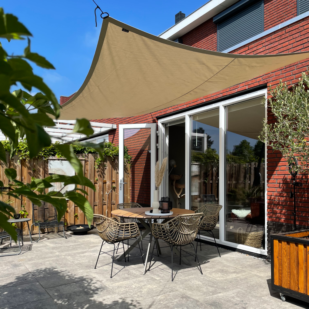 Het rechthoekige Livn schaduwdoek Livigno Oxford is een hoogwaardig zonnedoek gemaakt van polyester. Met een stofdikte van 270 gr/m² is dit materiaal zeer stevig en blijft het ook na langdurig gebruik in goede staat. Het geweven zonnezeil is behandeld met een ademende coating aan de buitenzijde en PU coating aan de binnenzijde. Zo stroomt regenwater gemakkelijk en snel van het waterafstotende doek af. Het doek is speciaal ontworpen om je te beschermen tegen verschillende weersinvloeden. Op warme dagen zit je heerlijk beschut en tijdens nattere dagen blijven jij én jouw tuinmeubelen droog. Is er wat vuil op het zonnezeil gekomen? Geen probleem, je maakt het gemakkelijk schoon met water.